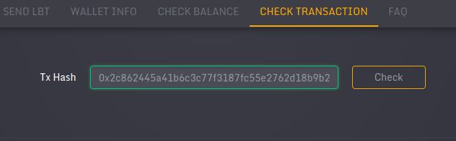 Select [CHECK TRANSACTION] in the main menu and fill the Tx hash of your transaction in the [Tx Hash] textbox.